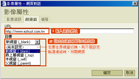 點選目標,下拉選擇新視窗(_blank),按確定完成。 |