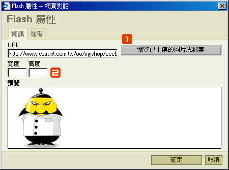 按下 開啟檔案(圖片)管理系統 ,選擇上傳Flash檔,便可在預覽框內看到動畫,URL也會顯示動畫路徑。 |