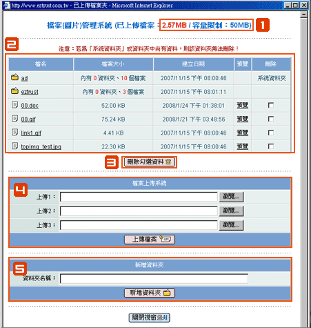 | 檔案(圖片)管理系統─提供您上傳圖片及檔案功能,並能自行建立資料夾,分門別類管理您的檔案及圖片。