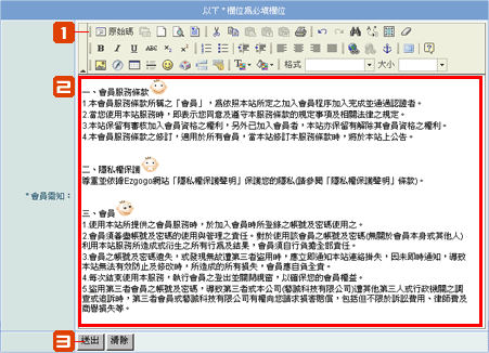 您可在此填寫加入會員需知,資料會顯示於前台申請加入會員>加入會員需知。