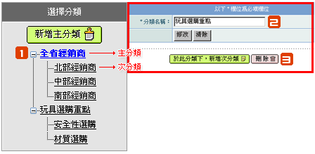 自訂頁面最多可建立到二層分類選項,您可在此新增、修改、刪除主分類和次分類選項。